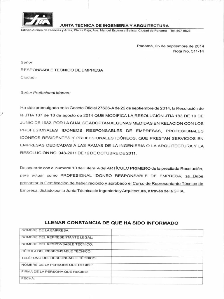 Registro de la empresa ante la junta técnica de ingeniería y arquitectura, según lo dispuesto por la resolución de junta técnica de ingeniería y arquitectura no. Que entre sus funciones está la de ser profesional idóneo responsable de empresa, en la rama de su idoneidad, ante la junta técnica de. Junta técnica de ingeniería y arquitectura formulario: