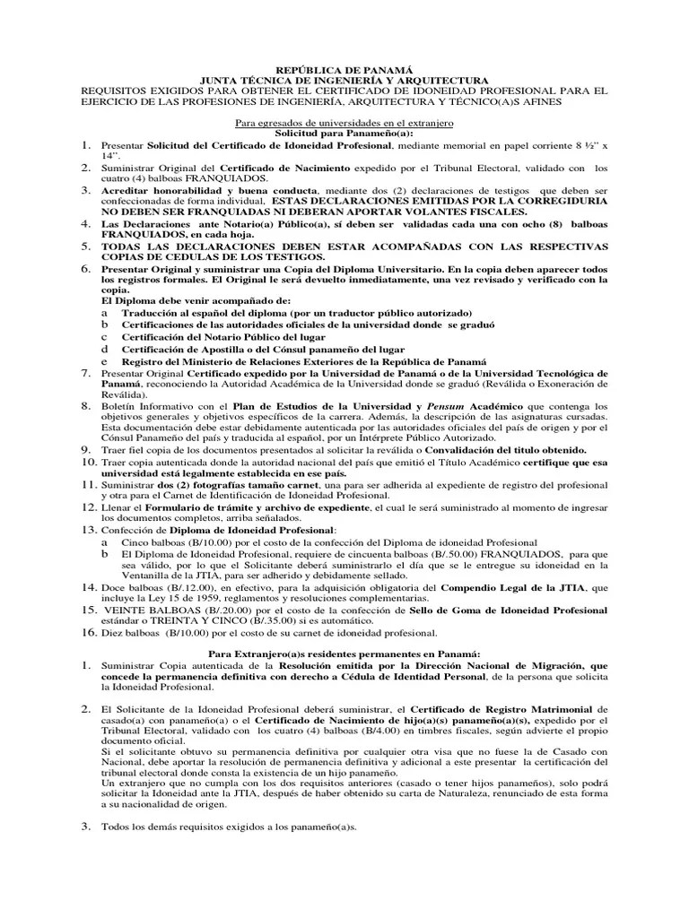 Junta técnica de ingeniería y arquitectura... República de panamá junta técnica de ingeniería y arquitectura requisitos exigidos para obtener el certificado de idoneidad profesional para el ejercicio de las profesiones de ingeniería, arquitectura y técnico(a)s afines para egresados de universidades en el extranjero solicitud para panameño(a): Junta técnica de ingeniería y arquitectura formulario:. República de panamá junta técnica de ingeniería y arquitectura requisitos exigidos para obtener el certificado de idoneidad profesional para el ejercicio de las profesiones de ingeniería, arquitectura y técnico(a)s afines para egresados de universidades en el extranjero solicitud para panameño(a):